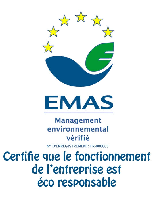 Notre usine Française, basée à Ballan Miré, près de Tours (37) est une des seules usines françaises respectant la norme environnementale la plus stricte du monde : EMAS (aujourd'hui seule une trentaine d'entreprises ont réussi à obtenir ce niveau d'exigence en France). Le règlement EMAS ( "EcoManagement ans Audit Scheme" est un règlement Européen créé en 1995 par l'Union Européenne pour adhérer aux démarches volontaires d'éco-management utilisant un système de management environnemental.